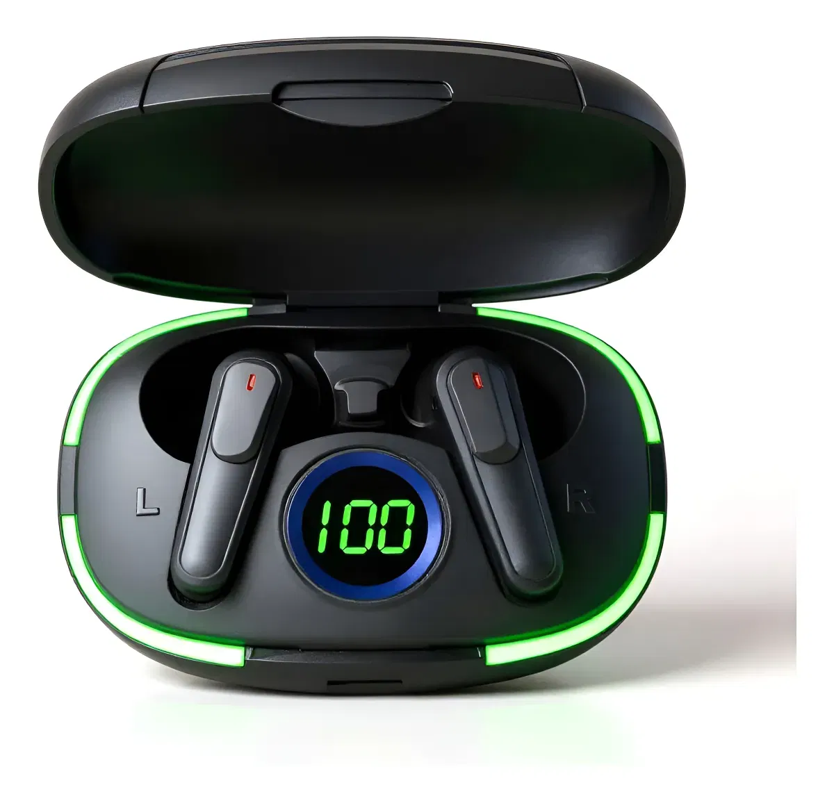 - Estuche de Carga: Estuche compacto con pantalla LED para visualizar el porcentaje de batería de la caja y los auriculares.