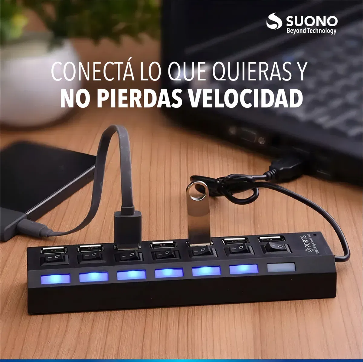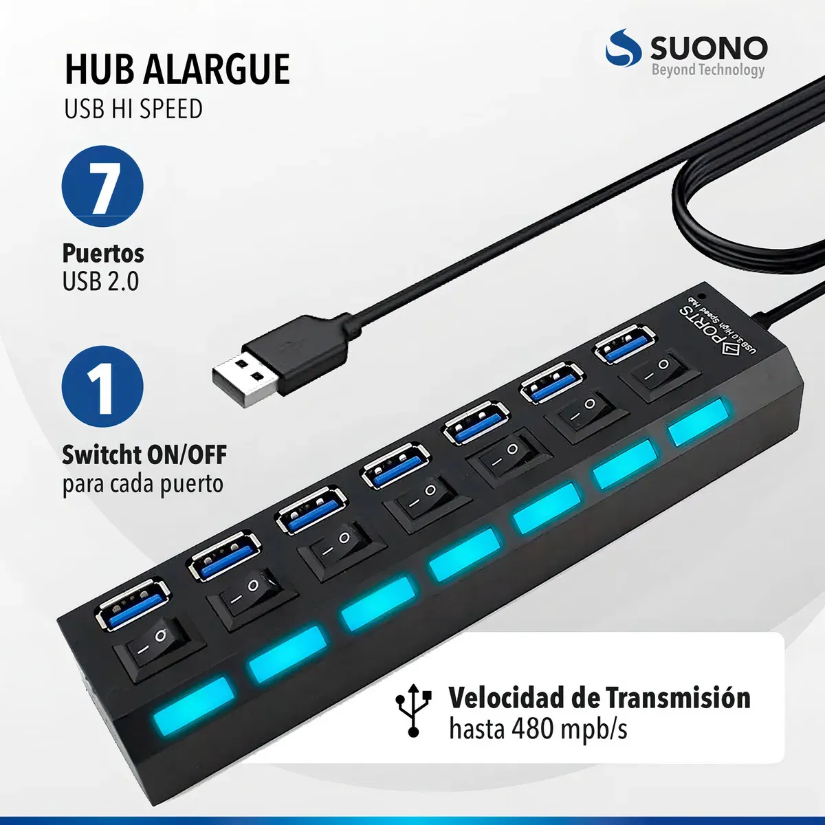 - Incluye 7 puertos USB 2.0 para múltiples conexiones simultáneas.