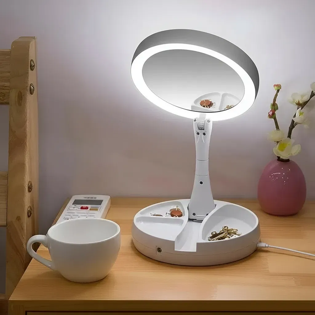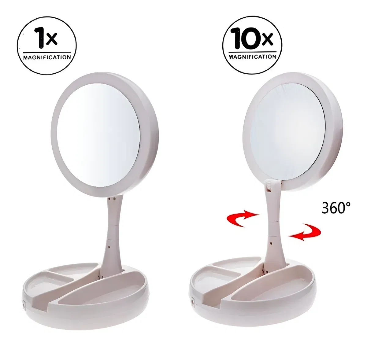 Transforma tu rutina diaria con este espejo de maquillaje con luz LED y aumento 10x, ideal para lograr cada detalle con precisión. Su diseño moderno, plegable y portátil lo convierte en el compañero perfecto tanto para el hogar como para tus viajes.
