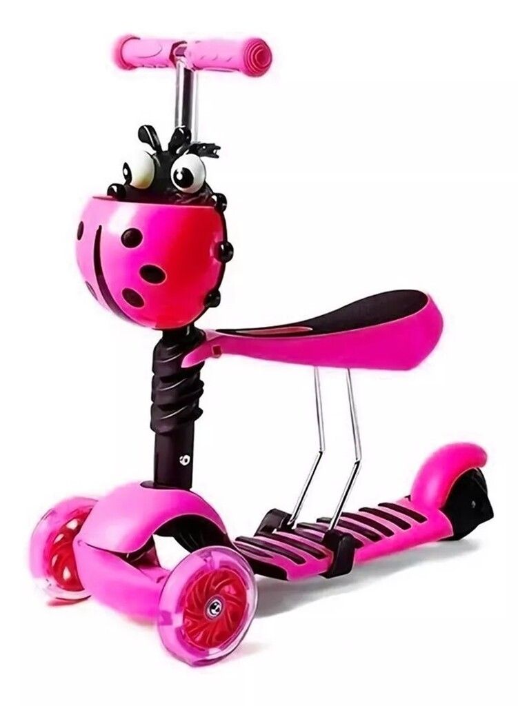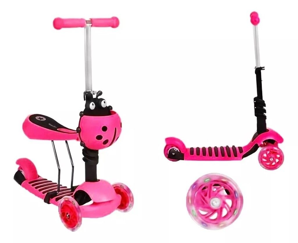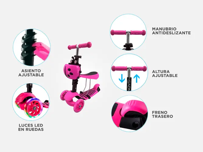 Tiene 3 opciones de altura ajustable. A medida que el niño crece, el manillar simplemente se mueve hacia arriba. Las ruedas están hechas de PU. Las luces LED insertadas en las ruedas dan un juego que les gusta a los niños.