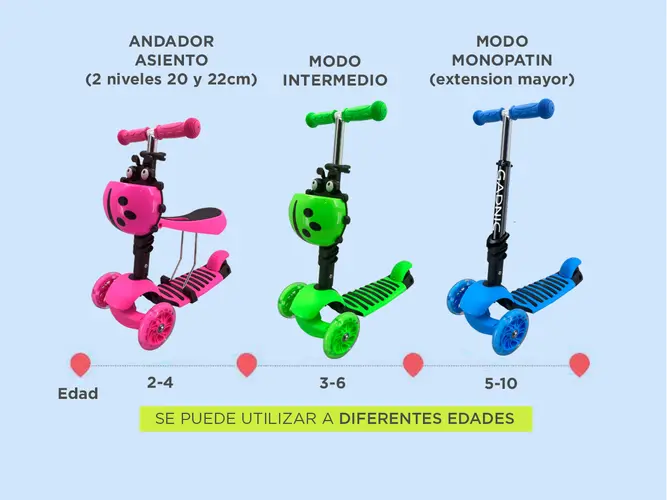 El Monopatin Andador Infantil 2 En 1 es un vehículo versátil que se transforma fácilmente en un andador para niños pequeños. Como andador, el asiento ajustable a 3 alturas diferentes permite su uso por un amplio rango de edades. Al desarrollar la estabilidad, se puede quitar el asiento y convertirlo en un monopatín de 3 ruedas con manillar ajustable también a 3 alturas.