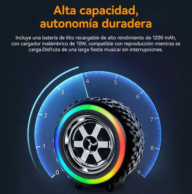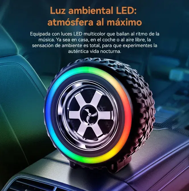 Llevá tu música a otro nivel con este original parlante Bluetooth con diseño de rueda automotriz. Compacto, potente y con estilo único, es perfecto para quienes buscan buen sonido y diseño con personalidad.